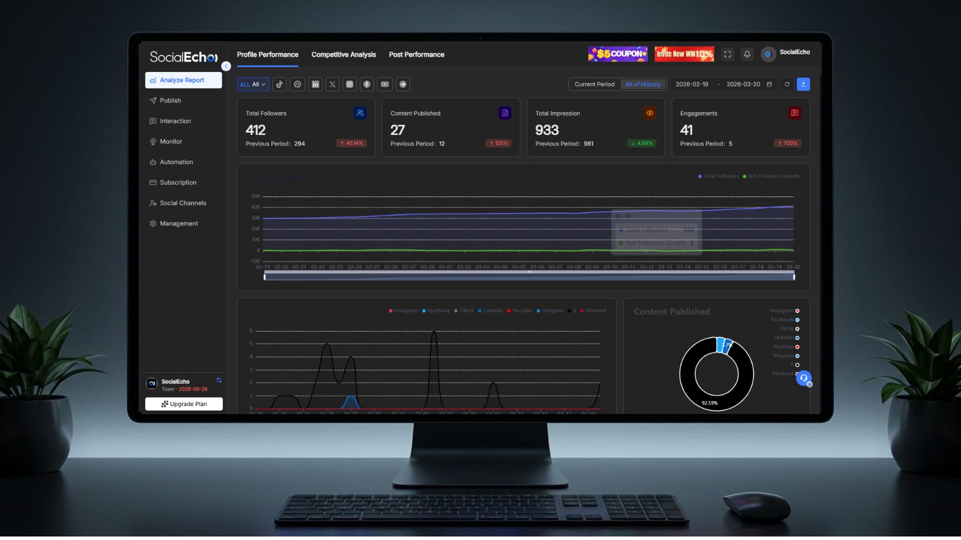 如果你是一支1-3人的出海品牌运营团队,同时管理多个平台(尤其包含TikTok、Instagram、Telegram等),每天要处理大量评论和互动,还需要定期出具多平台数据报告,那么SocialEcho是目前市面上最贴合这一场景的工具。它覆盖8大平台、AI自动化能力强、数据看板一屏呈现,能真正帮助小团队用最少的人力完成最多的运营工作。