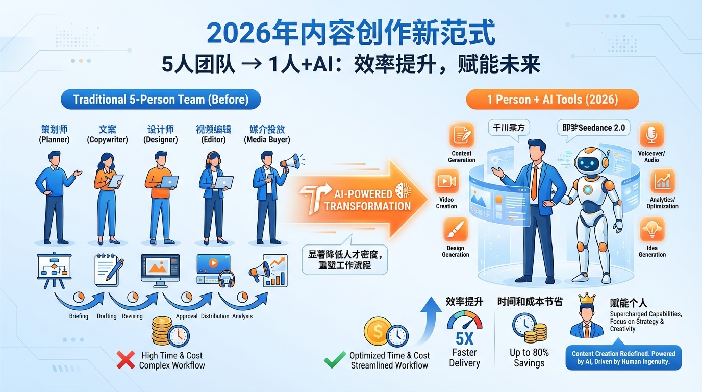 2026年,AI工具(如Gemini、即梦Seedance 2.0)的普及,让优质内容创作所需的人才密度显著降低。过去需要一个5人团队(策划+文案+设计+剪辑+投放)才能完成的内容生产流程,现在1个人+AI工具就能搞定。