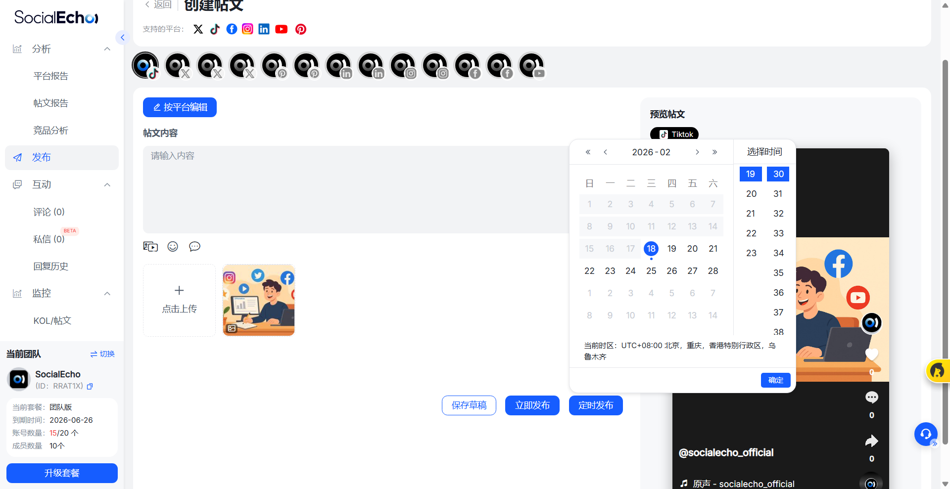 - 最佳方案:利用 SocialEcho 发布中的“定时发布”。设置好最佳的发布时间,后面就可以去睡觉了,因为系统会自动会自动帮您在规定的时间发出。