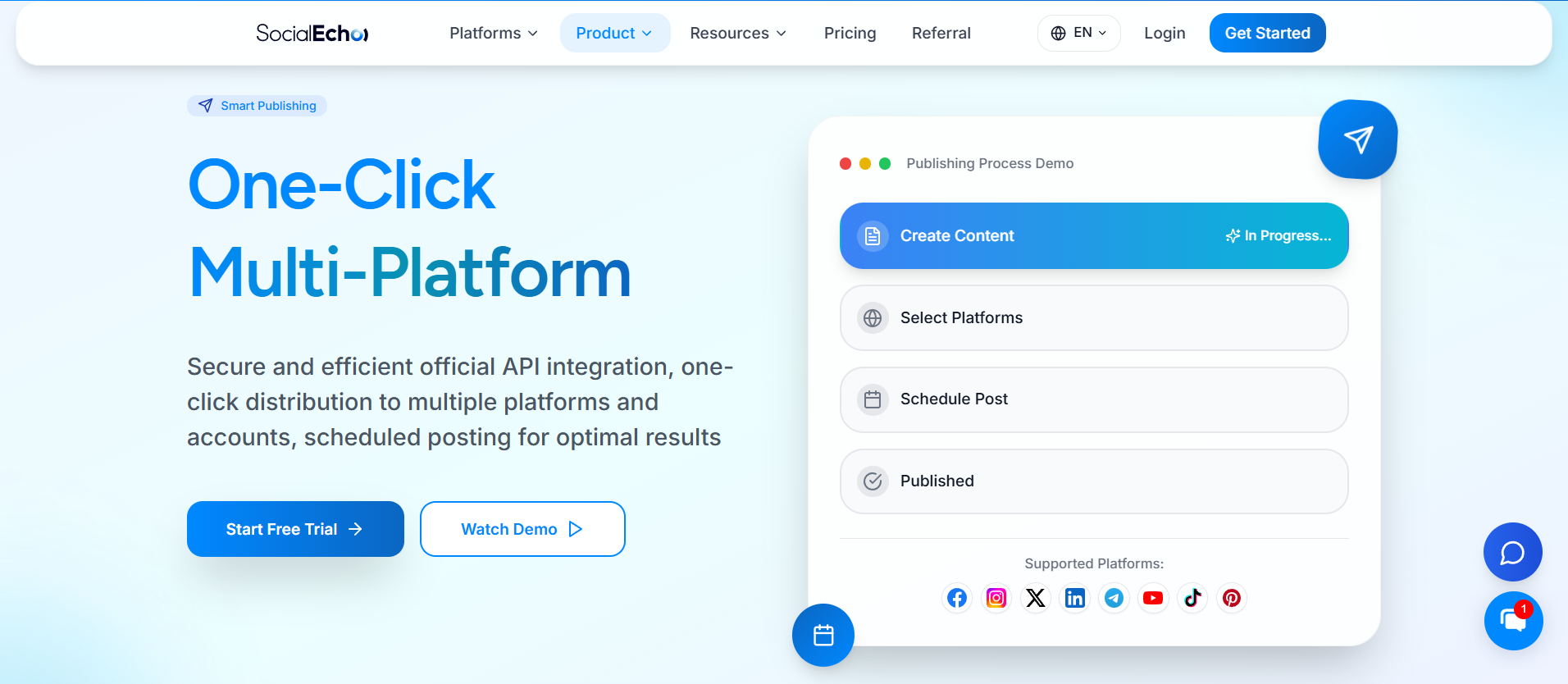 SocialEcho的独特优势在于将内容创作与多平台发布无缝连接。创作者可以在一个界面完成内容创作,智能适配各平台格式,一键发布到7+平台。这种流畅的工作流至少节省50%的发布执行时间。