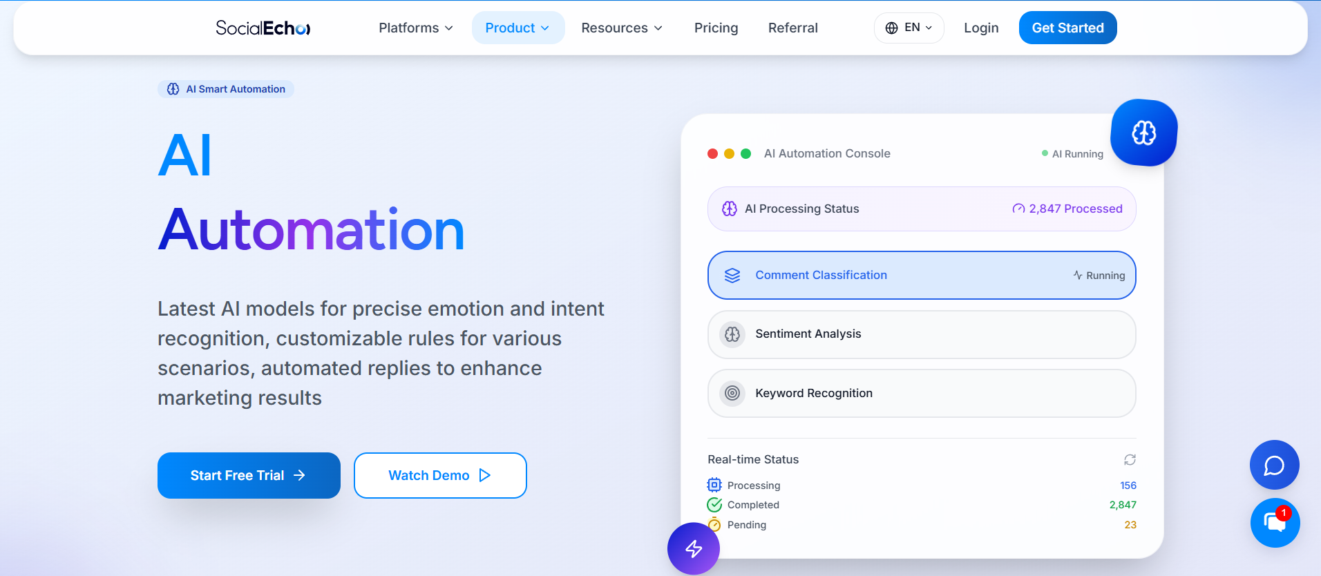 SocialEcho的AI自动化不是表面功能,而是真正能够减少90%重复劳动的核心能力。自动评论分类准确识别重要反馈;智能情绪分析实时监测品牌声誉;自动化回复处理80%常见咨询。