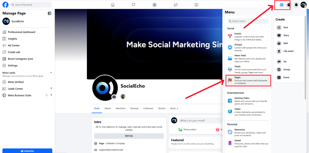 第一步:登录Facebook账号,点击右上角的九宫格(menu)标志,选择“公共主页(Pages)”。