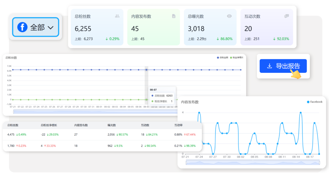 第一步:点击平台数据报告,选择Facebook,即可看到Facebook平台的粉丝数、内容量、曝光量、互动量等等,而且细化至天的数据分析,让内容运营&广告投放判断更精准