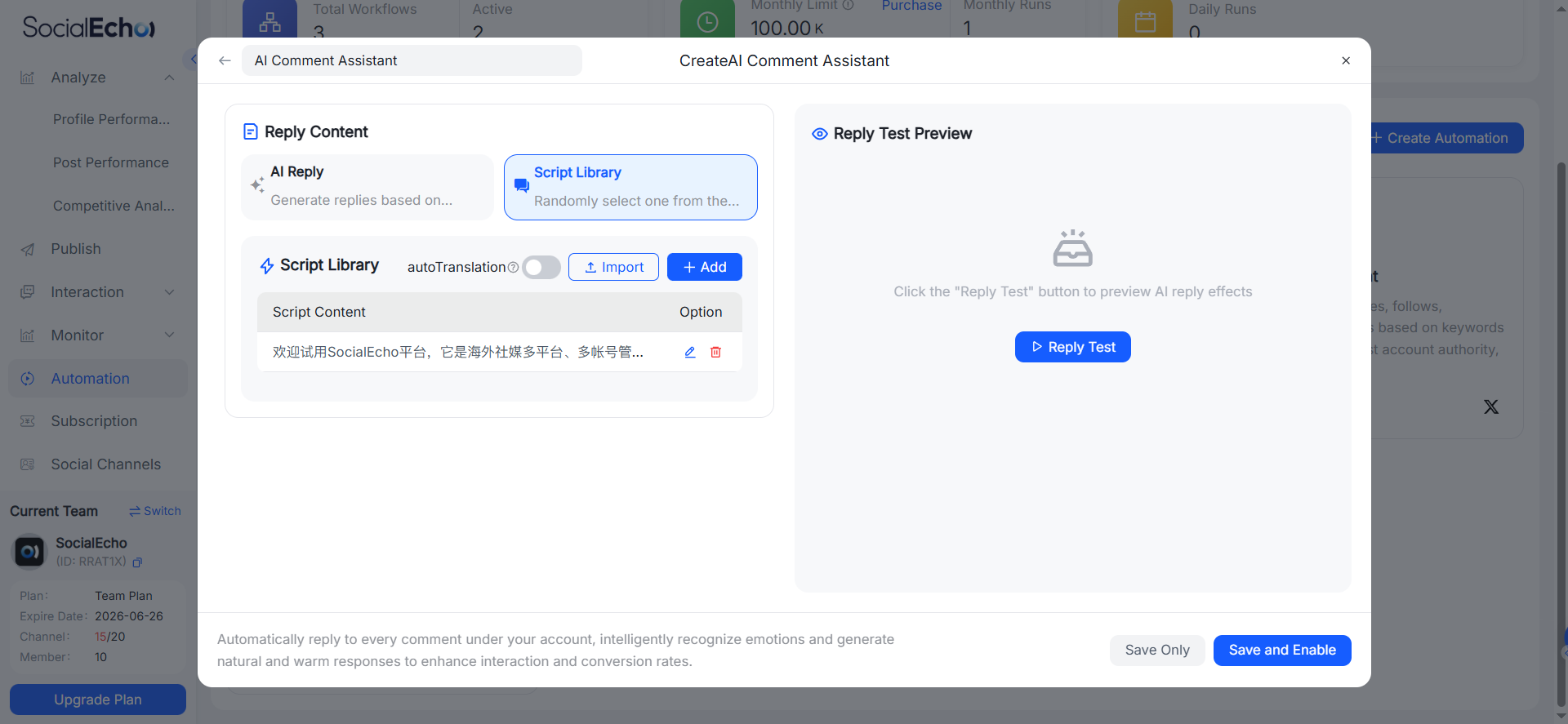 SocialEcho 功能 :TikTok 实时评论监控 + 智能自动回复 。